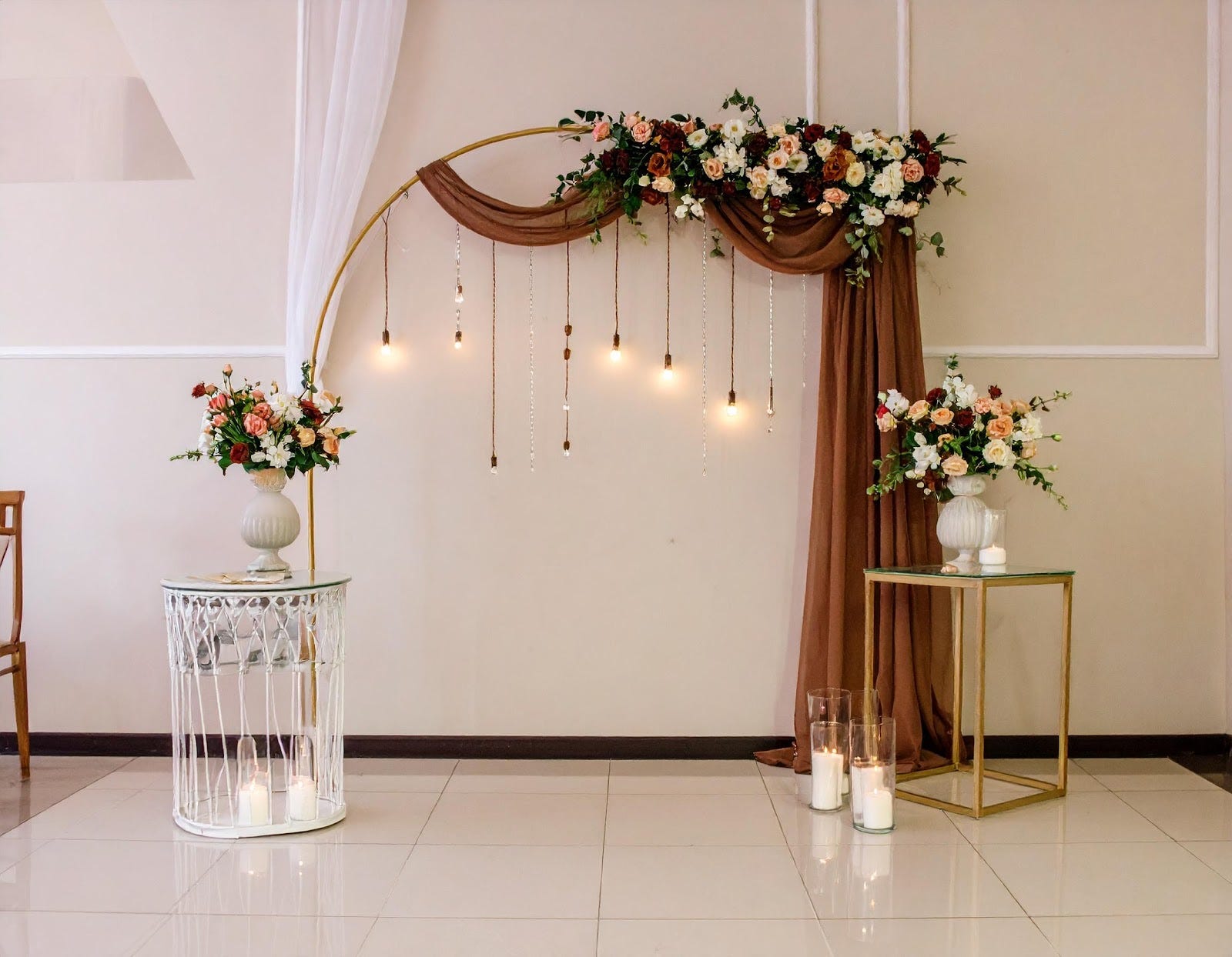 Για τη διακόσμηση της εκκλησίας ή του χώρου της τελετής, επίλεξε υφάσματα όπως ανάλαφρη γάζα σε mocha ή μπεζ αποχρώσεις για να δημιουργήσεις γιρλάντες και εντυπωσιακά drapes – μια από τις πιο ρομαντικές τάσεις της χρονιάς. Στην είσοδο, τοποθέτησε μεγάλα γυάλινα βάζα ή rustic καλάθια στις ίδιες γήινες αποχρώσεις, ενισχύοντας τη φυσική αρμονία του χώρου.
