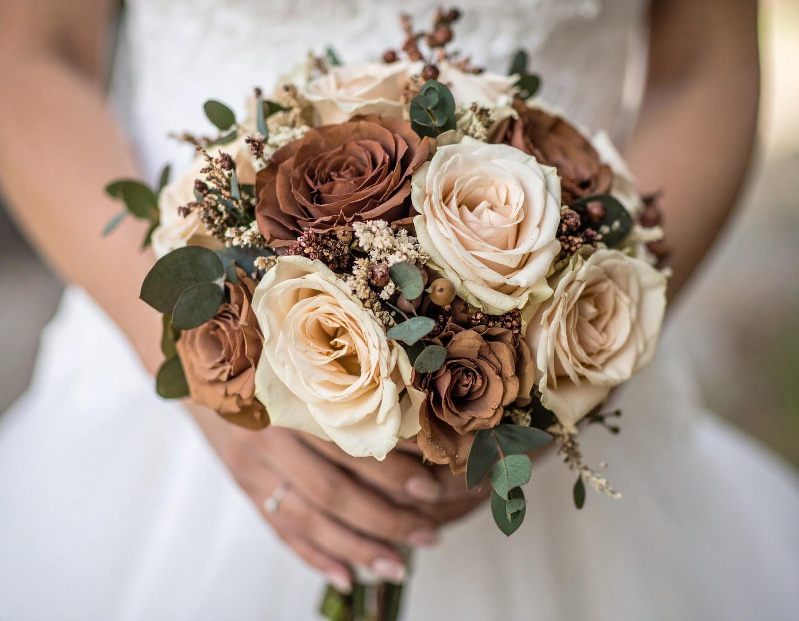 Τα παπούτσια σε καφέ, bronze ή nude αποχρώσεις ταιριάζουν ιδανικά, ενώ η ανθοδέσμη μπορεί να περιλαμβάνει cappuccino τριαντάφυλλα, astilbe, bunny tails, ορτανσίες και ranunculus με beige και καφέ αποχρώσεις. Δέσε την ανθοδέσμη με μια mocha silk κορδέλα ή craft σπάγκο για rustic λεπτομέρεια.