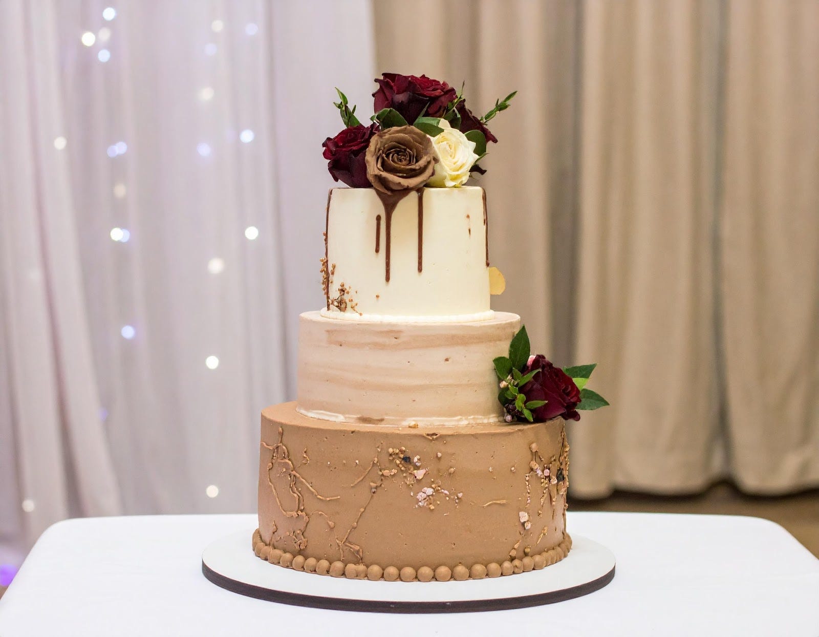 Η γαμήλια τούρτα μπορεί να μετατραπεί σε ένα πραγματικό έργο τέχνης με βάση το Mocha Mousse. Μια nude τούρτα με βουτυρόκρεμα σε αποχρώσεις cappuccino, με φλοράλ διακόσμηση και χρυσά flakes, θα εντυπωσιάσει με τη διακριτική της κομψότητα.